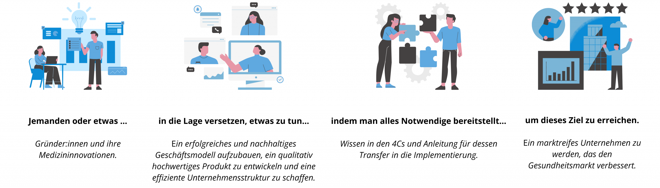 Unsere Erfahrung zeigt: Gerade für Gründer:innen sind Kenntnisse und Fähigkeiten der Entrepreneurship Essentials und gängige Methoden, wie Business Model Canvas, Design Thinking oder Lean Launchpad, zwar unerlässlich, um erfolgreich zu werden, benötigen Medtech-Startups jedoch zusätzliches Knowhow. Vor ähnlichen Herausforderungen stehen auch bereits etablierte Unternehmen, die eine Innovation außerhalb des aktuellen strategischen Fokus auf den Markt bringen möchten, sowie Unternehmen, die in dieser Branche ein neues Geschäftsfeld entwickeln möchten.